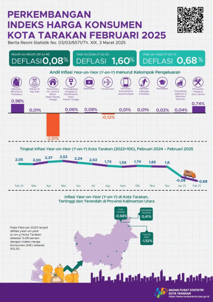 Perkembangan Indeks Harga Konsumen Kota Tarakan Februari 2025Pada Februari terjadi deflasi year on year (y-on-y) Kota Tarakan sebesar 0,68 persen deng...