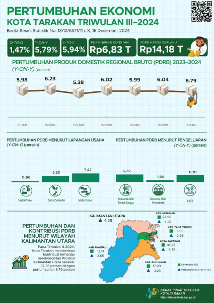 Perekonomian Kota Tarakan Triwulan III-2024 yang diukur berdasarkan Produk Domestik Regional Bruto (PDRB) atas dasar harga berlaku mencapai Rp 14,18 t...