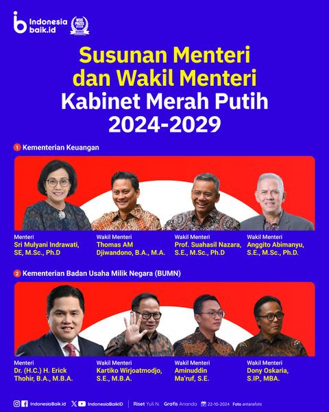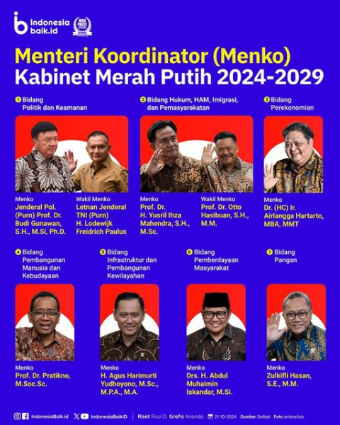 Menteri Koordinator Kabinet Merah Putih 2024-2029Kabinet Merah Putih periode 2024-2029 telah resmi diperkenalkan kepada publik dengan komposisi Menter...