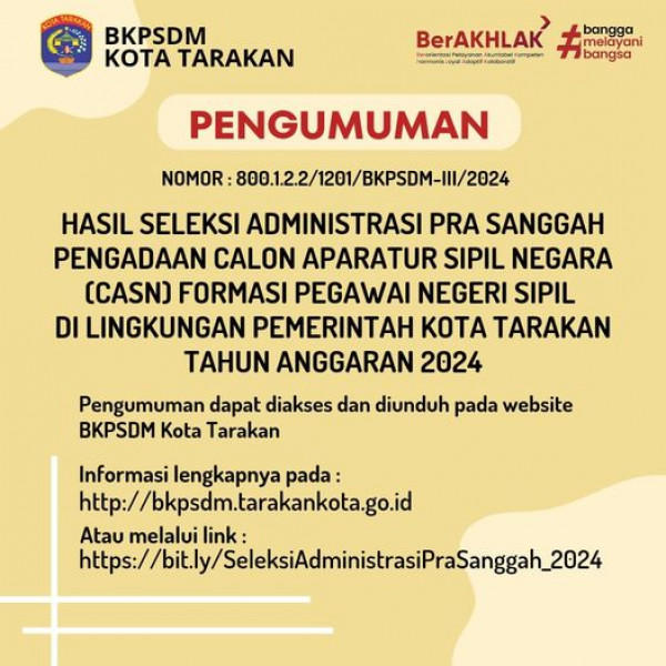 Pengumuman Hasil Seleksi Administrasi Pra Sanggah Pengadaan CASN Formasi PNS di Lingkungan Pemerintah Kota Tarakan Tahun 2024Sumber FB : YanLik B...