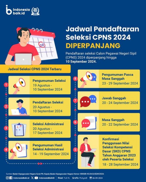 Jadwal Pendaftaran Seleksi CPNS 2024 DIPERPANJANGProses pendaftaran seleksi Calon Pegawai Negeri Sipil (CPNS) di portal SSCASN yang sebelumnya dijadwa...