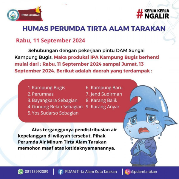 Wilayah Berdampak Terganggunya Pendistribusian Air Pelanggan PDAM TarakanSehubungan dengan pekerjaan pintu DAM Sungai Kampung Bugis. Maka produksi IPA...