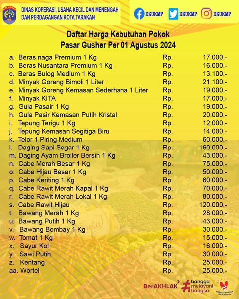 Daftar Harga Kebutuhan Pokok 1 Agustus 2024 di Kota TarakanUpdate Daftar Harga Kebutuhan Pokok di Kota TarakanTanggal 01 Agustus 2024#DKUKMP #Bapok #K...