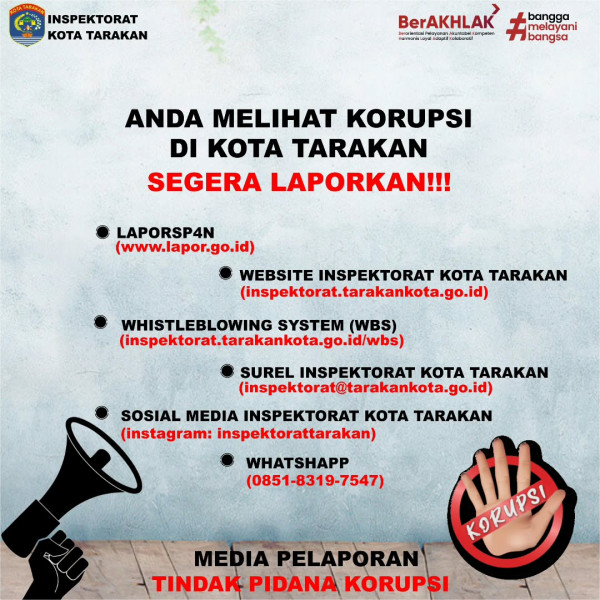 Anda Melihat Korupsi Di Kota Tarakan, Ayo Segera LaporkanKita Semua Wajib Tahu Bahwa Inspektorat Kota Tarakan Memiliki Kanal - Kanal Media Pelaporan T...