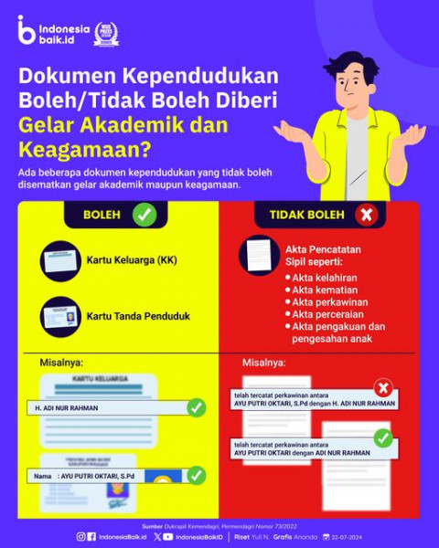 Dokumen Kependudukan Boleh/Tidak Boleh Diberi Gelar Akademik dan Keagamaan?Masyarakat diperbolehkan mencantumkan gelar pada beberapa dokumen kependudu...