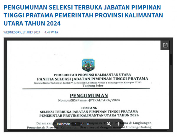 PENGUMUMAN SELEKSI TERBUKA JABATAN PIMPINAN TINGGI PRATAMA PEMERINTAH PROVINSI KALIMANTAN UTARA TAHUN 2024Klik : Download di Google DriveSumber :...