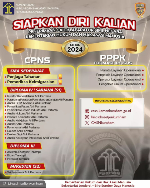 Penerimaan Calon ASN Kementrian Hukum dan HAM Tahun 2024Putra-Putri terbaik Bangsa Indonesia, ayo bergabung bersama Kementerian Hukum dan HAM menjadi...