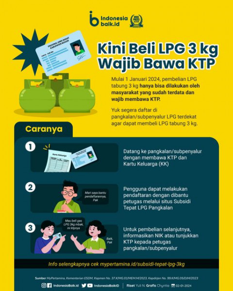 Mulai 1 Januari 2024, pembelian LPG tabung 3 kg hanya bisa dilakukan oleh masyarakat yang sudah terdata dan wajib membawa KTP. Hal ini sesuai dengan K...