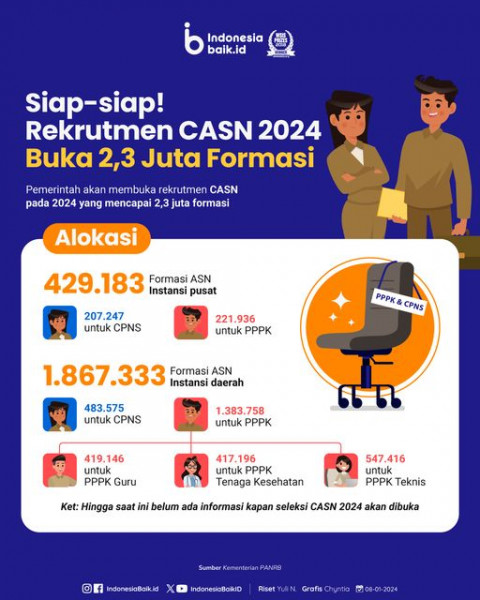 Pemerintah mengumumkan pembukaan seleksi calon aparatur sipil negara atau ASN. Total jumlah rekrutmen ASN pada 2024 mencapai 2,3 juta formasi. Ta...