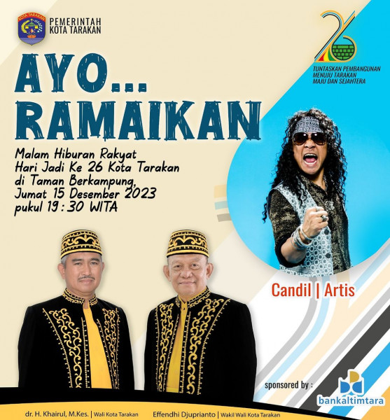 Ayo Ramaikan Malam Hiburan Rakyat Hari Jadi Ke 26 Kota Tarakan di Taman BerkampungJumat, 15 Desember 2023Pukul 19.30 wita