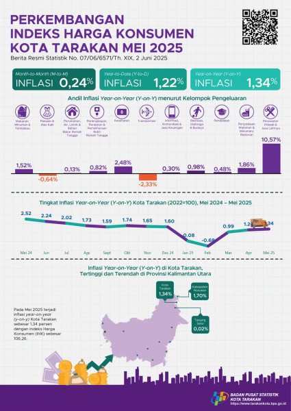 Perkembangan Indeks Harga Konsumen Kota Tarakan Mei 2025Pada Mei terjadi inflasi year on year (y-on-y) Kota Tarakan sebesar 1,34 persen dengan Indeks...